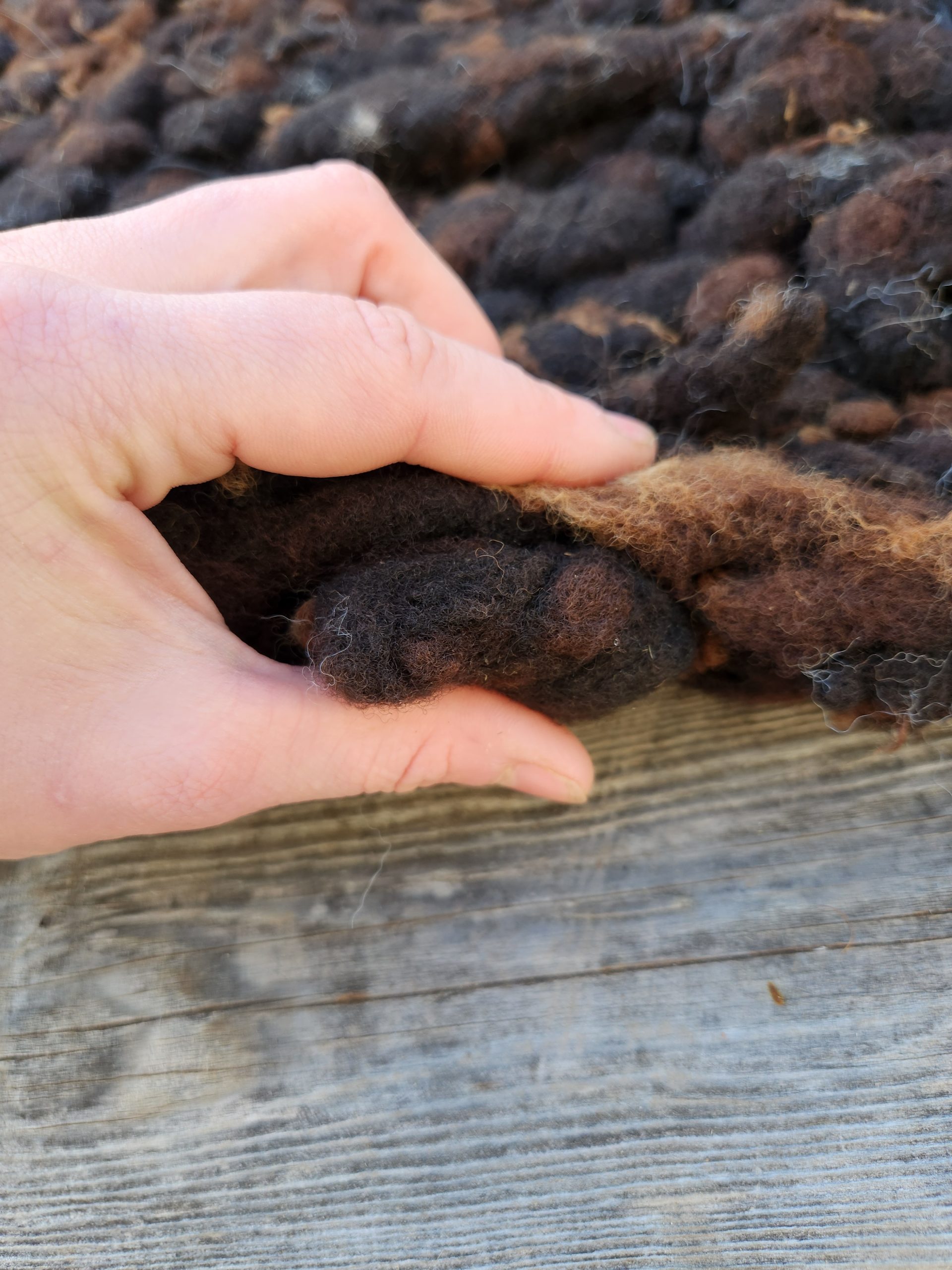 Thick, dense, chocolate sheep’s wool rug with brown crimped tips.