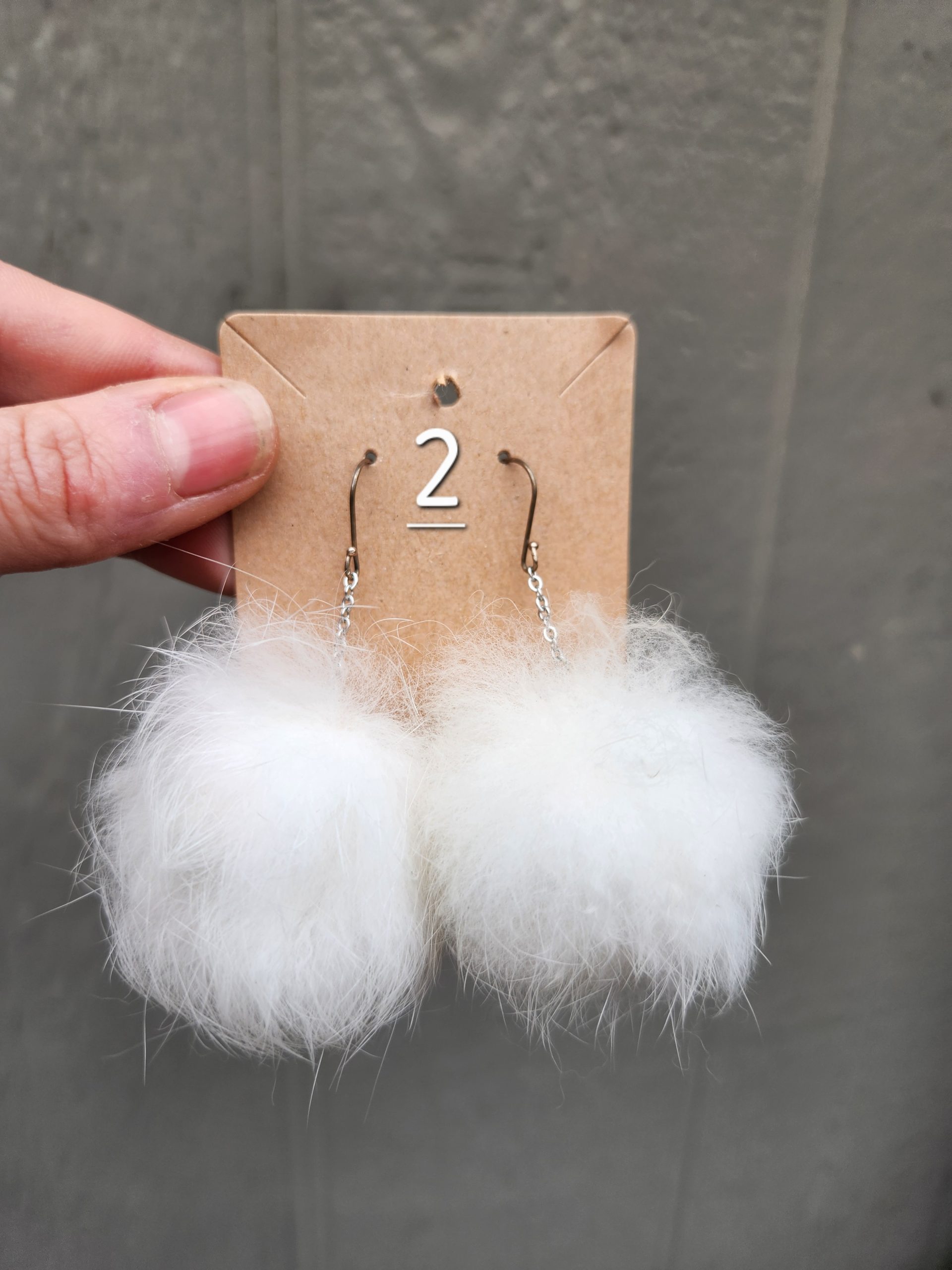 A unique and fluffy earring made of our rabbit’s hide.