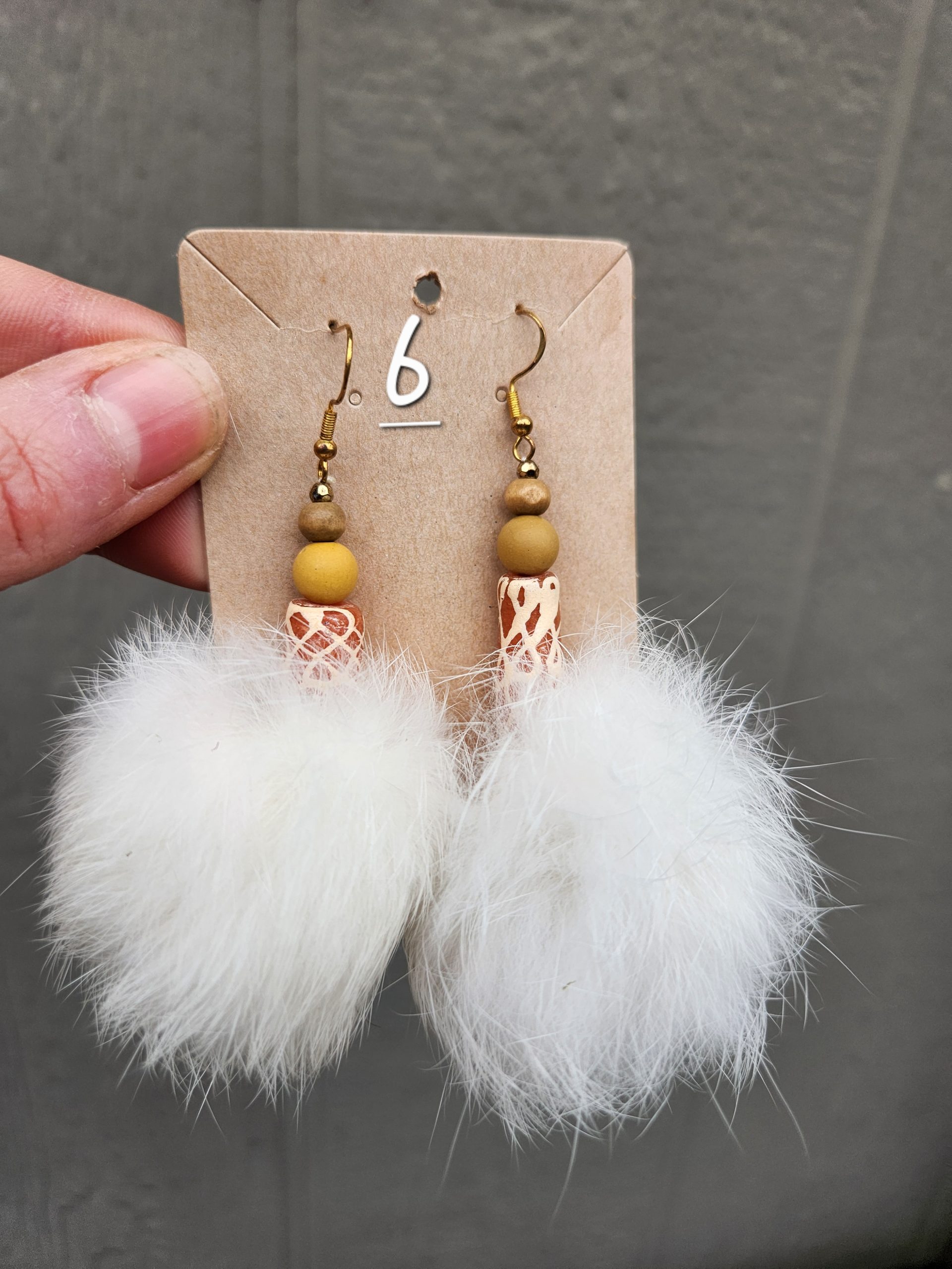 Note- the pom poms are not perfect circles, usually. One might appear bigger than its partner but they hang the at the about the same length (with the exception of pair 6. Those beads were handmade in Africa and one hangs lower than the other).